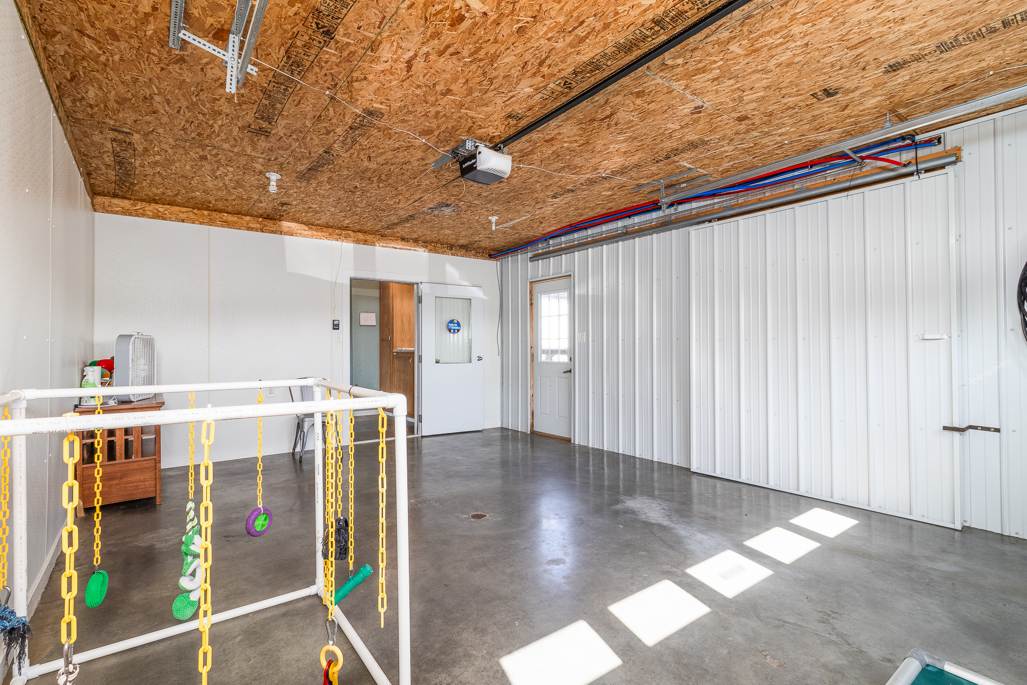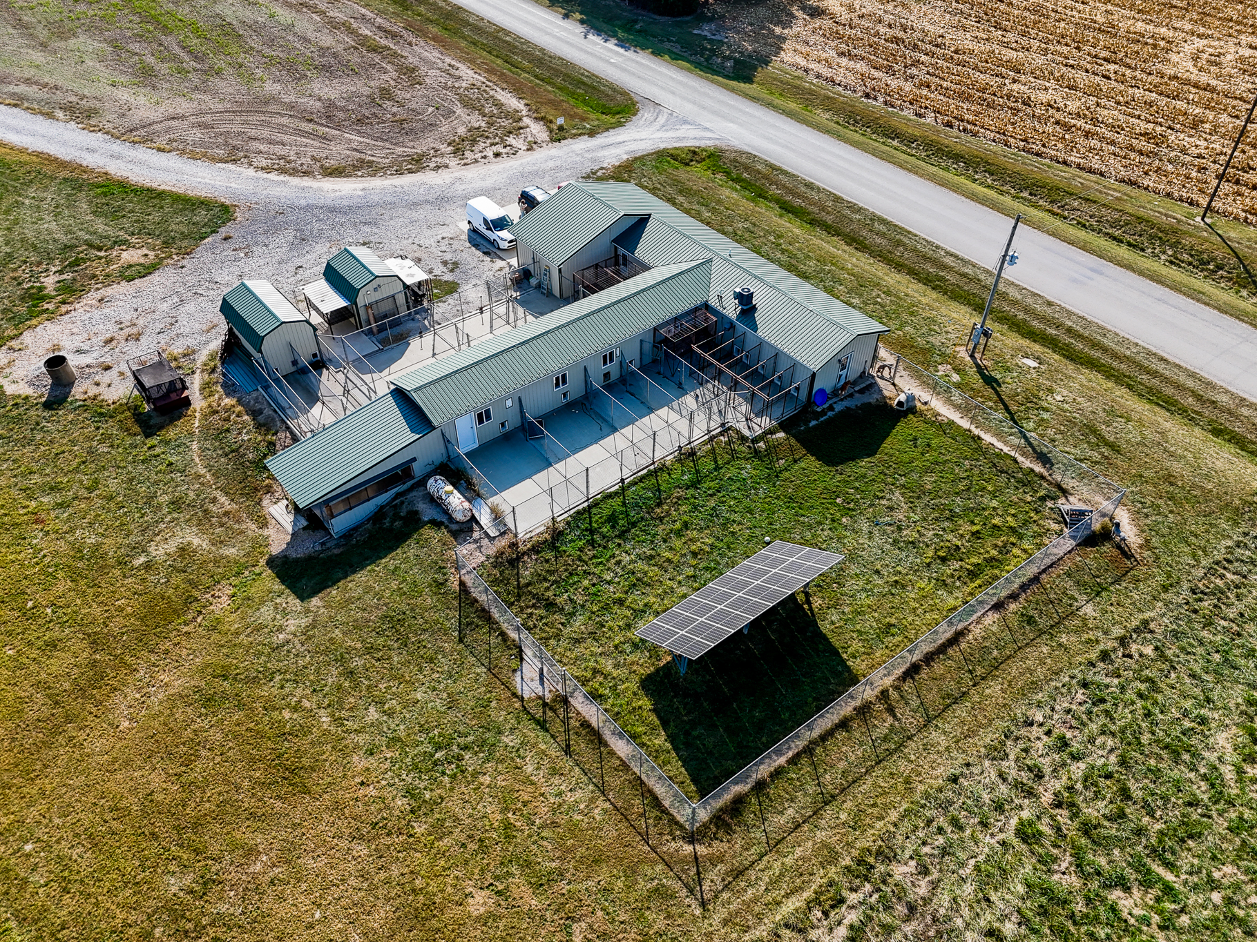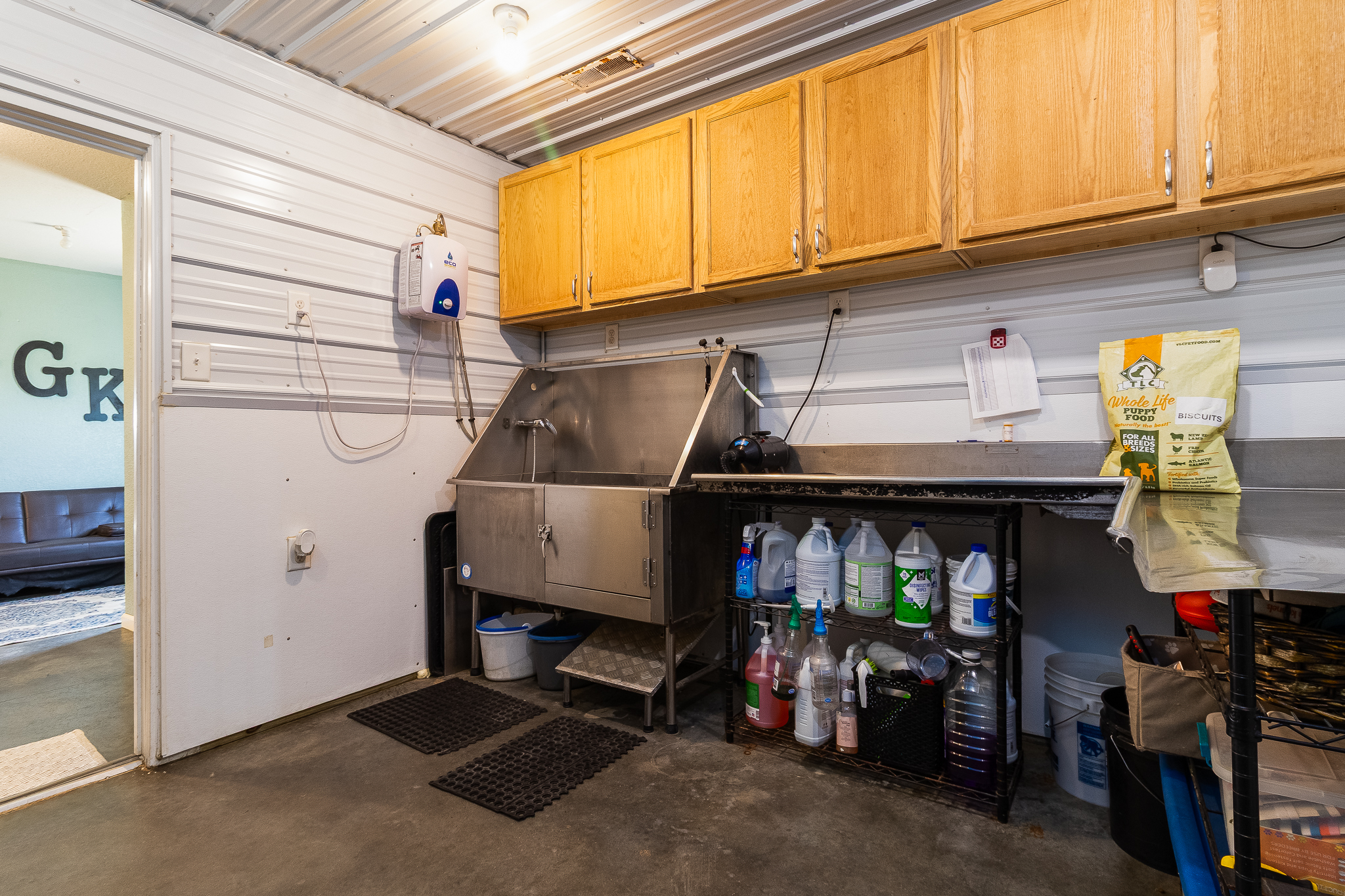 The building features heated floors powered by a propane heater, complemented by a backup electric forced-air furnace, ensuring year-round comfort and reliability for both animals and staff. Inside, you’ll find multiple indoor kennels, a small office space with a dedicated grooming area, and a layout that supports efficient daily operations.